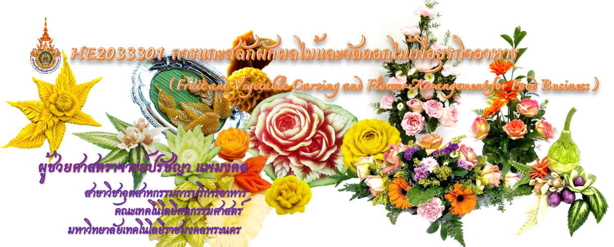 ผักและผลไม้ที่ใช้ในงานแกะสลัก อุปกรณ์การแกะสลักผักผลไม้ เทคนิคการแกะสลักผักผลไม้ วิธีการแกะสลักผักผลไม้ลวดลายขั้นต้นและลวดลายขั้นกลาง วัสดุอุปกรณ์ในการจัดดอกไม้ การเลือกซื้อดอกไม้และวัสดุตกแต่งการจัดดอกไม้รูปแบบต่างๆ ตามสมัยนิยม การควบคุมต้นทุนการผลิตงานแกะสลักผัก ผลไม้ และการจัดดอกไม้สำหรับธุรกิจอาหาร